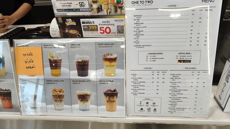 最近、バンコクでもよく見かけるようになってきたカフェのチェーン店「One To Two Coffee」。場所は、地下鉄MRTラマ9駅を出てすぐのショッピングモール、フォーチュンタウンの1階で入口に入ってすぐのところです。向かいはスターバックスになります。